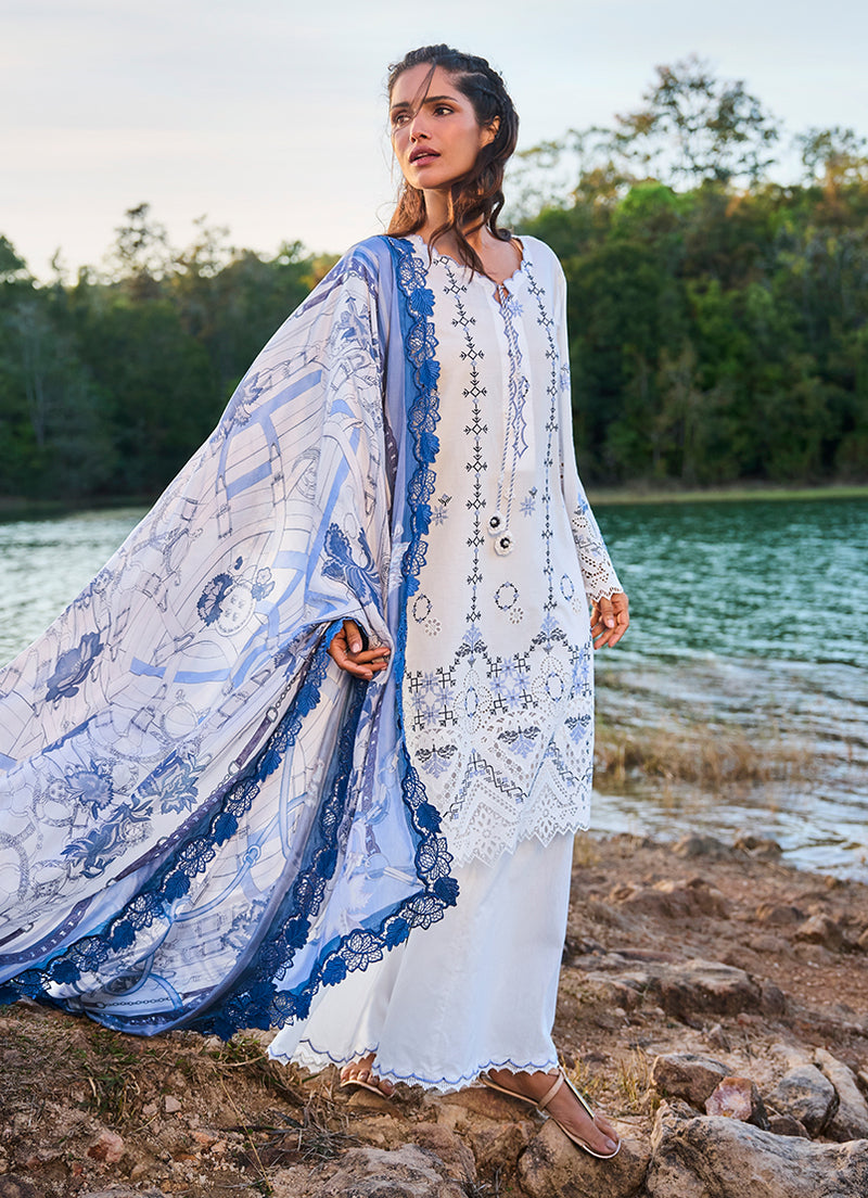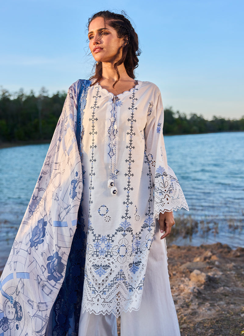 Soft and timeless in a white palette, this unstitched pure cotton lawn shirt features delicate blue motifs arranged in vertical and geometric patterns, creating a clean and refined fabric design. Ornamental borders along the hem add depth and visual balance to the overall look. Paired with a pure cotton cambric trouser and a pure silk dupatta with complementary detailing, the ensemble feels light, breathable, and effortlessly elegant for summer wear.