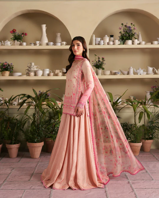 Radiating effortless charm, Amelia captures a refined festive allure. Cut from a printed peach and pink Korean raw silk, the shirt is delicately adorned with crystal and pearl detailing. Paired with a coordinated sharara and a printed chiffon dupatta, this look promises to put you in spotlight.