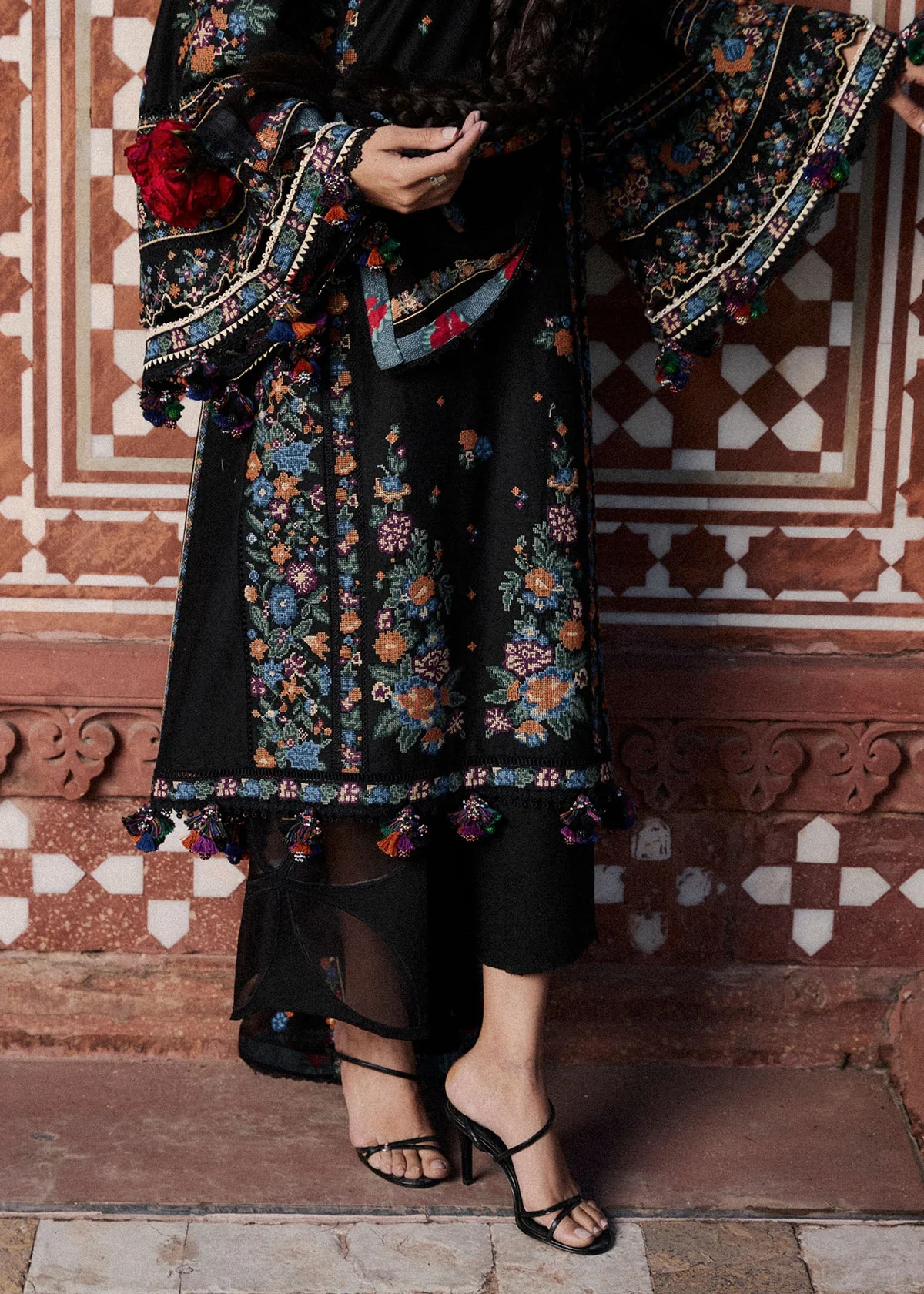 A striking jet black ensemble, a true statement piece for the festive season. Designed in a graceful A-line silhouette, it features vibrant cross-stitch embroidery arranged with artistic precision, adding depth and character to the look. Paired with a black chiffon dupatta adorned with delicate embroidery, this outfit exudes timeless elegance and refined allure.