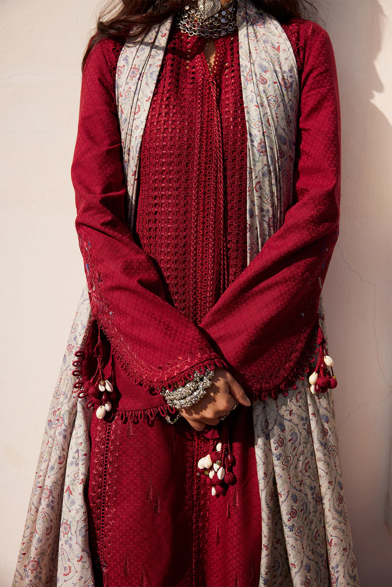 This deep red cutwork shirt showcases a fashionable front-open style, exuding a blend of elegance and modernity. The intricate cutwork details add a unique touch to the shirt, making it a standout piece. It is beautifully complemented by a printed contrast dupatta that enhances the overall appeal with its vibrant patterns. The outfit is perfectly paired with stylish azaar pants, which provide both comfort and a flattering fit. This ensemble is ideal for occasions where you want to make a statement while maintaining a sense of sophistication.