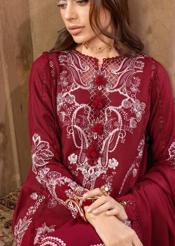 An ode to autumn’s ardent grace. A flowing silhouette in deep brick red karandi, this ensemble blooms with bold botanical embroideries flowing down the panels in shades of Scarlett, cream, and warm tea pinks. A neckline adorned with eastern paisley motifs dancing around delicate florals, lend an artisanal whisper of charm. The woollen shawl ends in warm chai pink with deep brick red, nodding to the rustic joys of harvest, with embroidery playfully dividing the two shades. A Fully embroidered and rich in detail is paired with karandi trousers adorned with delicate embroideries at the hem. A dreamy fall statement, perfect for the season that quietly unfolds in elegance.