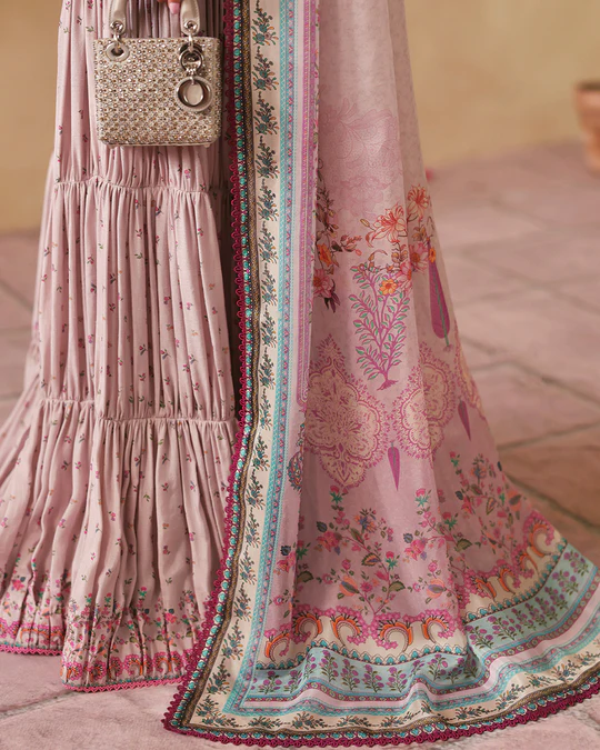 Elegant and poised, Janine brings a classic silhouette to life. Cut from dusty mauve silk, the embellished shirt enriched with resham and crystal detailing is paired with a printed Korean Raw Silk gharara. Styled with a printed silk dupatta, this ensemble elevates your presence at every celebration.