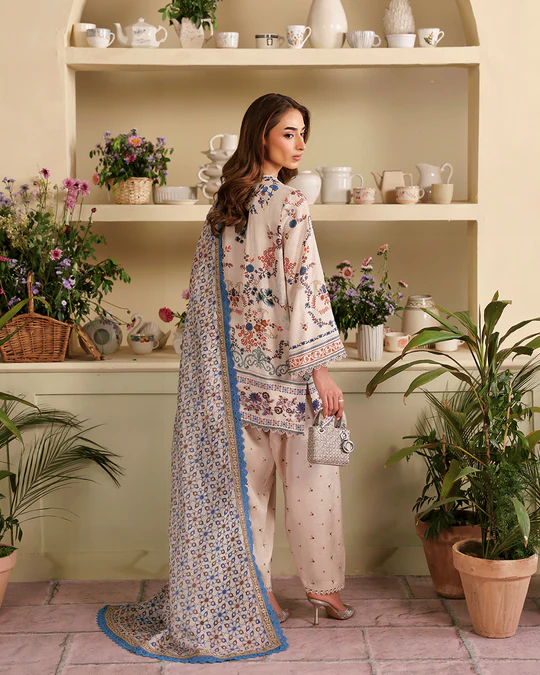 Exuding understated elegance, Jennet redefines classic femininity. Cut from biscuit and blue printed Korean raw silk, the embellished shirt adorned with subtle crystal accents is paired with a delicately printed shalwar. Completed with a printed cotton net dupatta, this look offers timeless appeal and effortless ease.