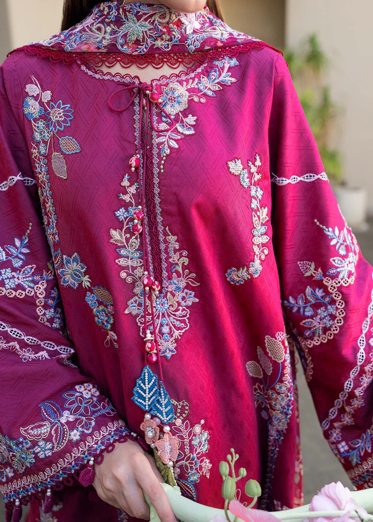 •  Embroidered dupatta four-sided border (organza) – 8.5 yards