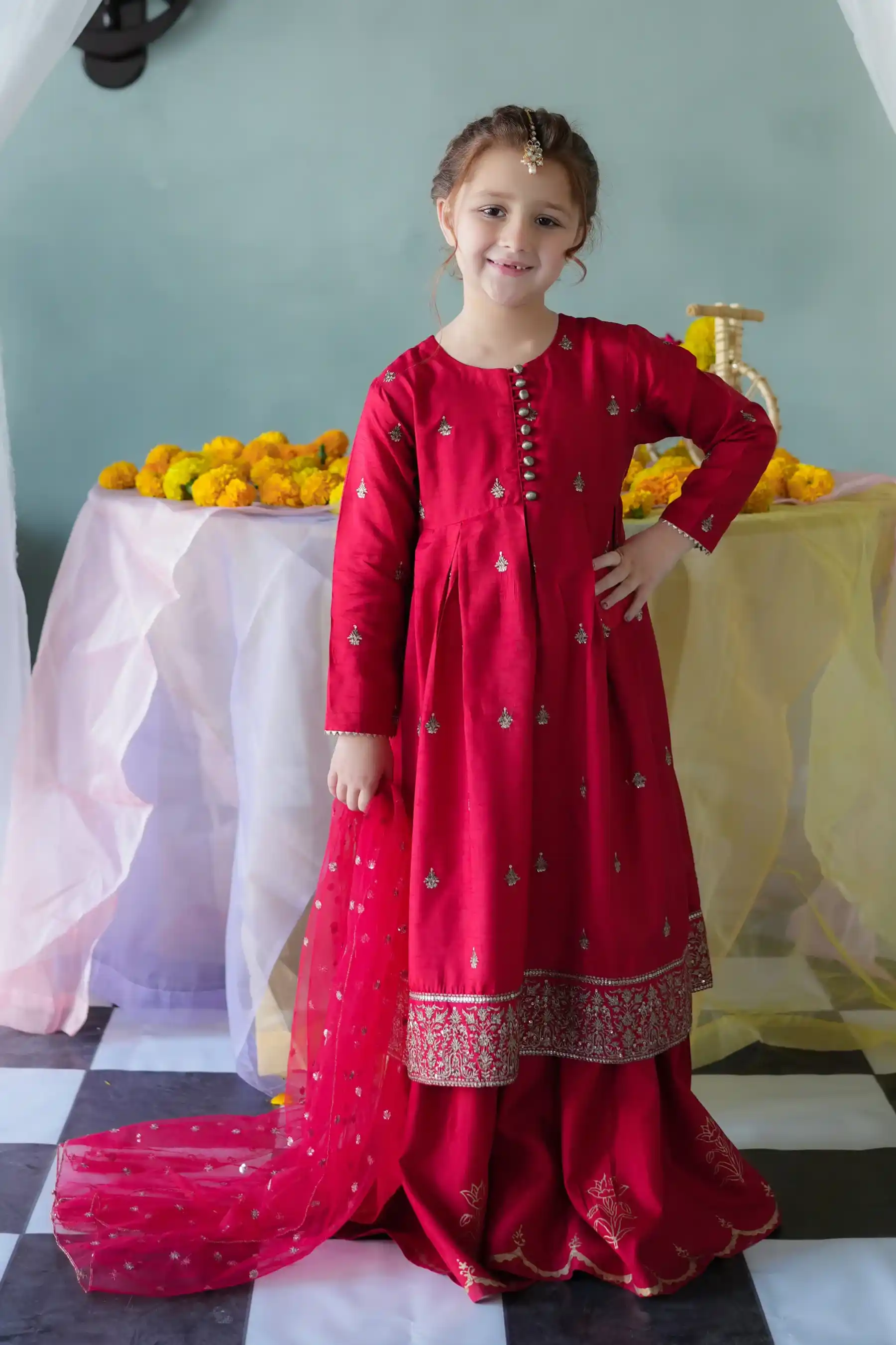 The model is wearing our 9-10 years size. Please refer to the size chart for measurements.
