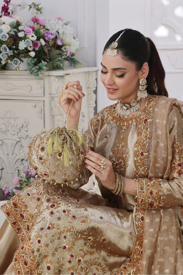 (Shirt) Pure embellishments of resham, dabka with zardozi of gold, antique, silver, sequence with crystal.