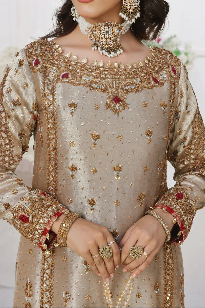 (Shirt) Pure embellishments of resham, dabka with zardozi of gold, antique, silver, sequence with crystal.