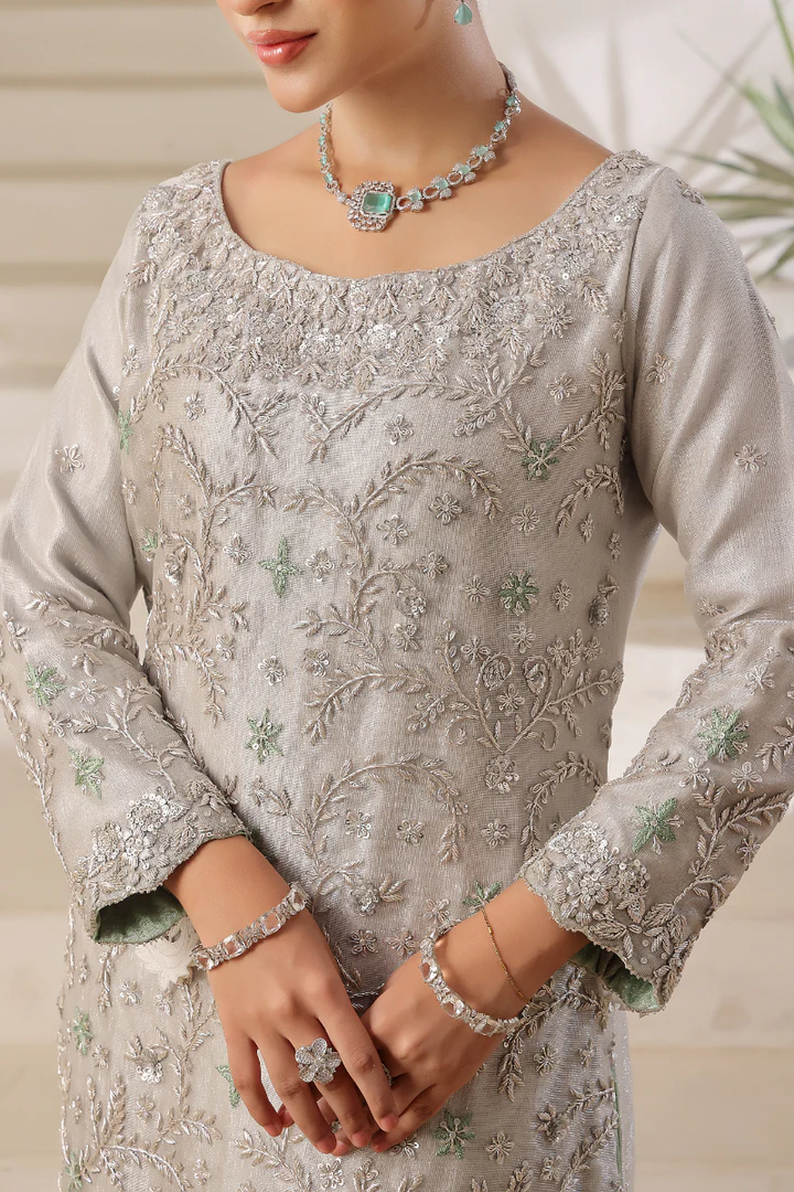 The shirt features intricate silver kora and dabka embroidery, delicately hand-embellished with shimmering sequins and sparkling Swarovski crystals, ensuring you stand out with luminous grace. The dupatta is adorned with dabka, crystals, and sequins, while the izhaar carries matching dabka, crystal, and sequin embroidery for a cohesive, opulent finish.