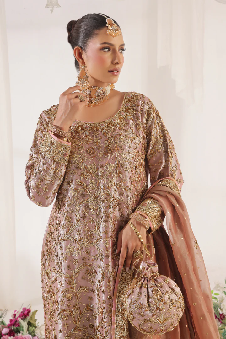 The shirt is exquisitely embellished with gold dabka work, shimmering sequins, and intricate zardozi embroidery, blending tradition with a contemporary pastel palette. The dupatta mirrors this artistry with matching gold dabka, sequins, and zardozi detailing, while the hijaar features refined zardozi work for a subtle yet sophisticated finish.
