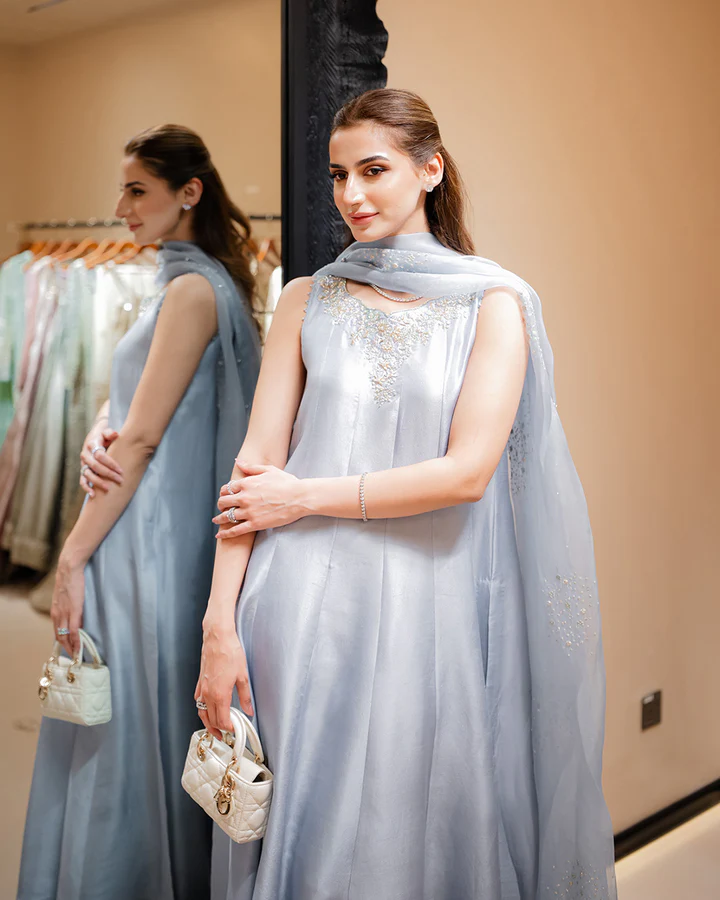 Harnessing refined sophistication, Margot radiates grace. Cut from opulent powder blue raw silk, the shirt and culottes feature daintily embellished resham and pearl adornments. Paired with an embellished organza dupatta, this piece is truly eye catching and versatile.