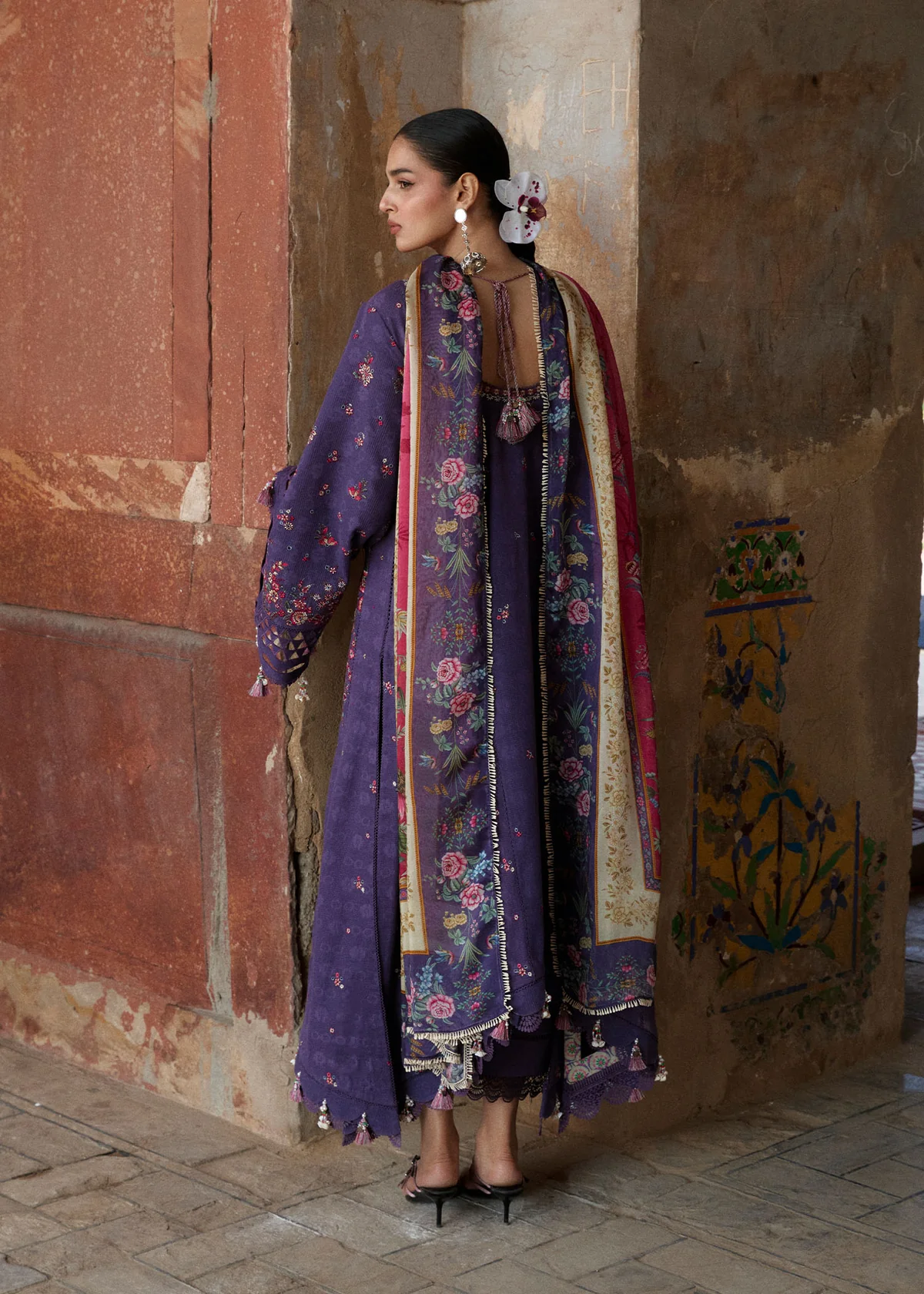 A rich dark purple jacquard ensemble designed for the summer festive season, featuring a striking asymmetric composition accented with lively hues of red and pink. Paired with a beautifully printed silk dupatta, this look exudes modern elegance with a vibrant twist.