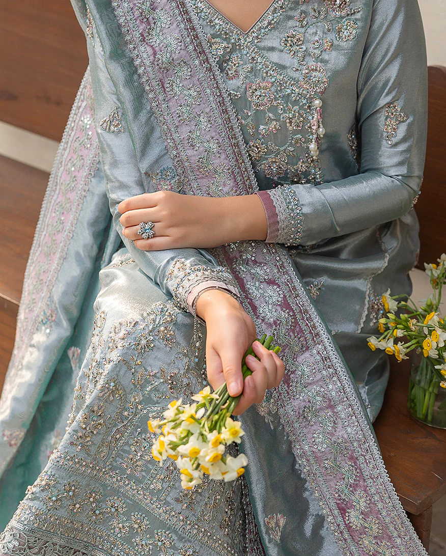 • Graceful zari tissue dupatta adorned with an embroidered border and delicate floral motifs.