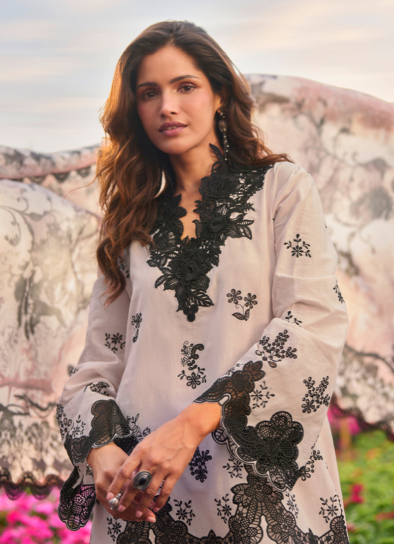 Subtle and refined in a pale peach tone, this unstitched ensemble is crafted from pure cotton lawn, featuring striking contrast embroidery that forms an intricate pattern across the fabric. Ornamental motifs and bold, scalloped borders add depth and definition to the design, creating a visually rich surface. Paired with a pure cotton cambric trouser and a luxurious pure silk dupatta, this set offers a graceful balance of softness and statement detail for elevated summer dressing.