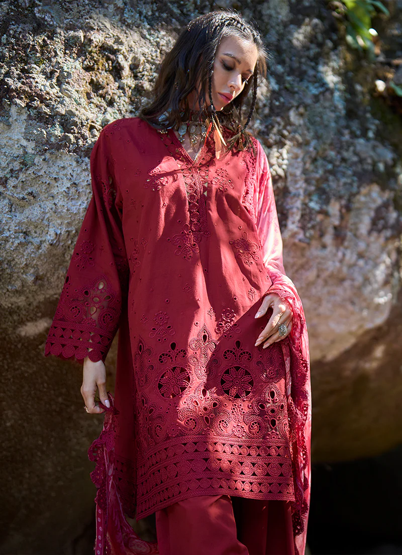 This unstitched pure cotton lawn shirt is presented in a rich red tone, detailed with intricately composed floral and geometric fabric motifs that create a striking all-over pattern. The surface design is enhanced with decorative borders that add depth and structure to the fabric while maintaining visual balance. Paired with a pure cotton cambric trouser and a printed chiffon dupatta, the ensemble offers a breathable feel with bold, statement-making fabric detail suited for summer wear.
