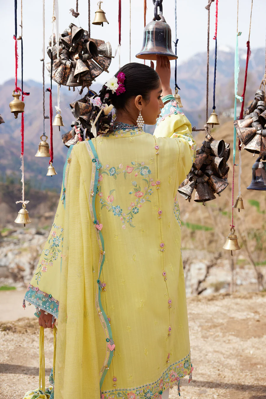 A luminous ode to spring, this butter-yellow ensemble unfolds in delicate pastel florals scattered across a softly textured canvas. Fine embroidery traces the neckline and hem with quiet intricacy, while subtle aqua accents and petite tassels introduce a gentle rhythm of artisanal detail.A textured cotton net dupatta completes the look  light, airy, and delicately adorned with embroidered sprigs and scalloped borders that drift with effortless grace. Paired with ivory trousers featuring subtle geometric motifs and embroidered cuffs, the silhouette feels polished yet ethereal. Framed by vintage bells and mountain horizons, RUÌMĚI 瑞美 ( carries a sun-kissed serenity, feminine, radiant, and timelessly refined.