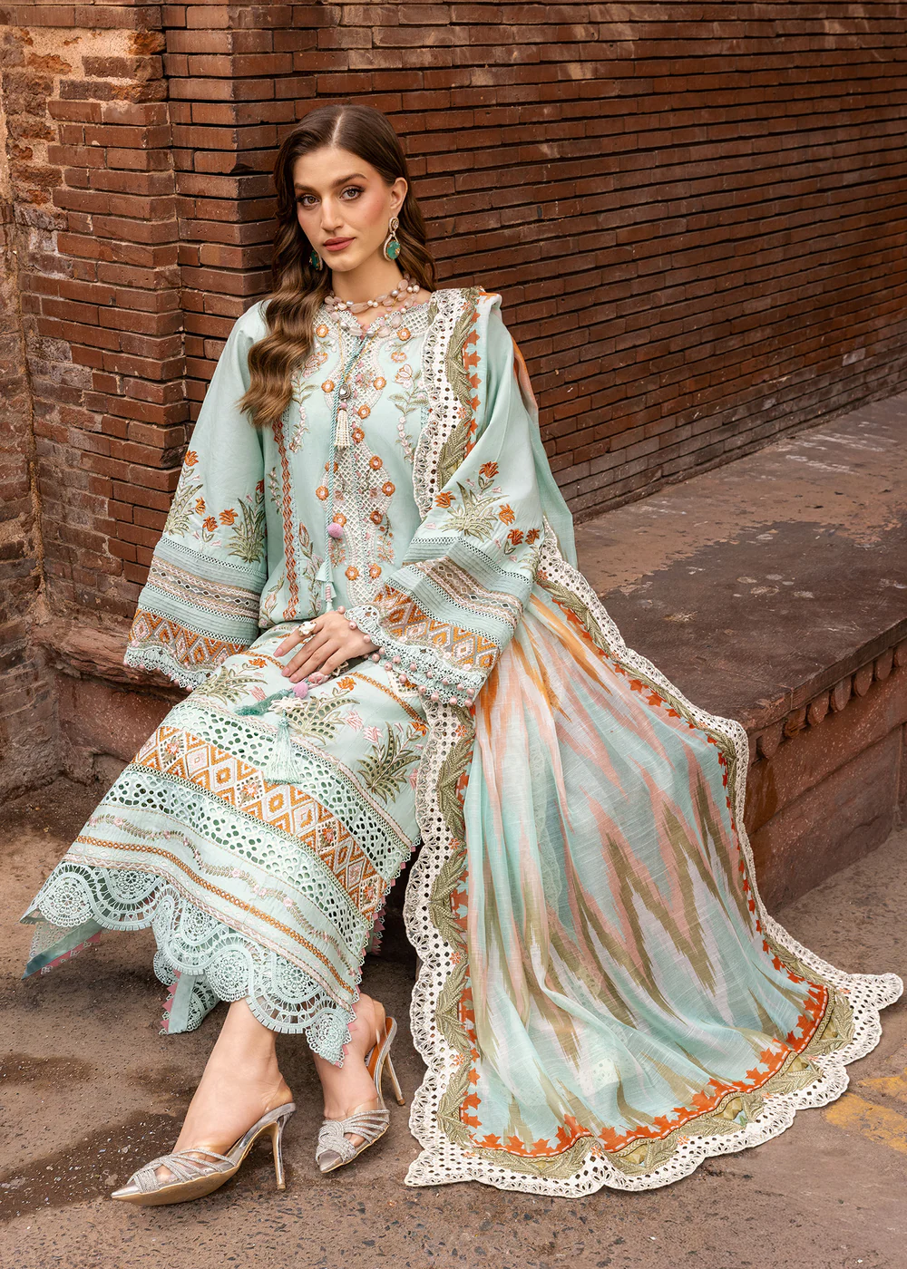 A vision of mint serenity, this exquisite variant unfolds on a luxurious mint canvas, lavishly adorned with intricate Moroccan-inspired Schiffli embroidery in serene shades of tangerine, ivory, and sage. The interplay of these refined hues against the cool refreshing backdrop creates an aura of quiet mystery and timeless sophistication.