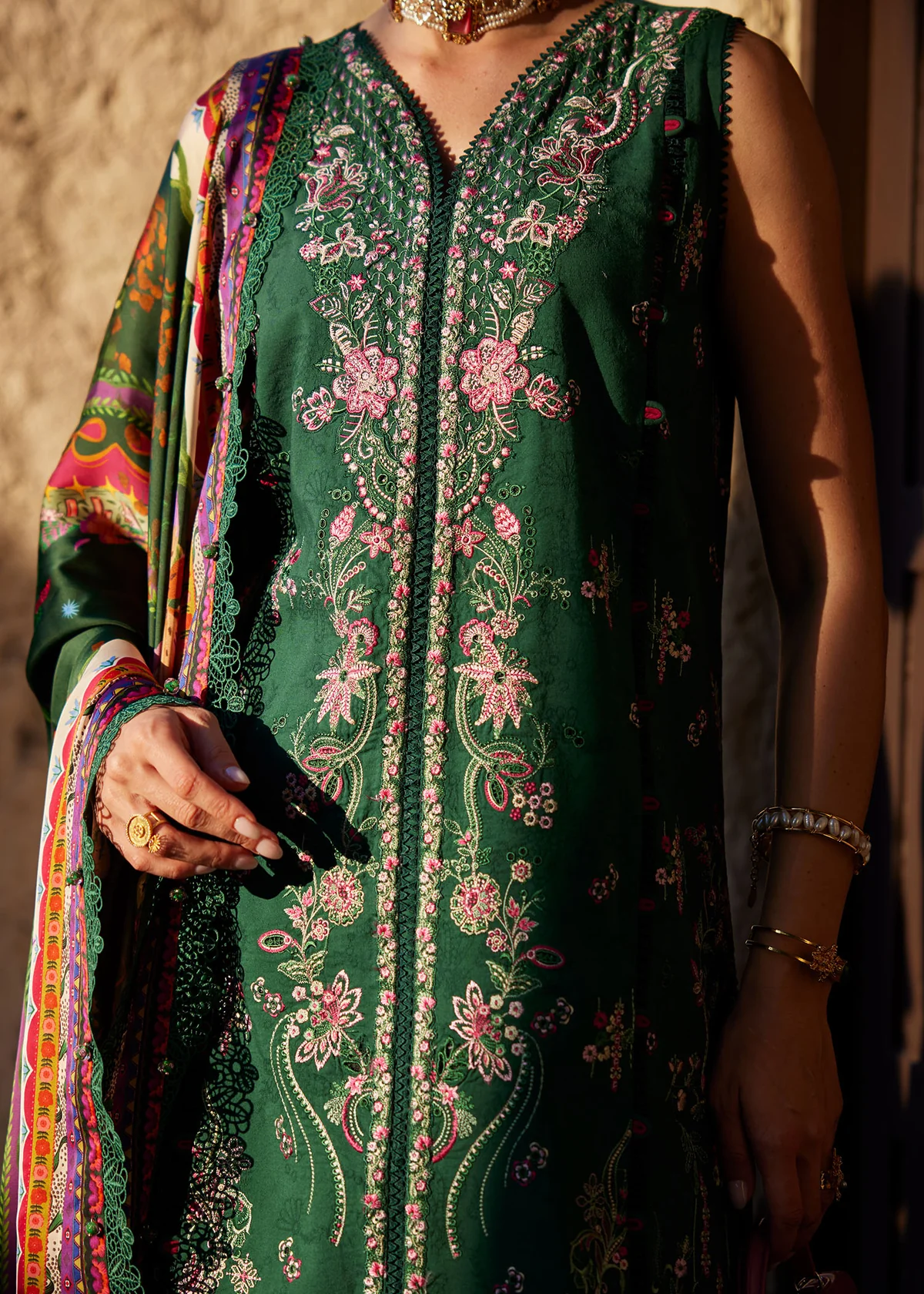 Step into the season with this luxurious emerald green ensemble from our premium lawn collection. The front-open lawn shirt is a true testament to craftsmanship, featuring dense floral embroidery in shades of magenta and blush, enhanced by delicate lace inserts that highlight its elongated, structured silhouette. Paired with a printed silk dupatta, the look gains fluid sophistication and a subtle sheen, elevating the ensemble’s elegance. Completed with matching azar pants adorned with a finely embroidered hem border, this outfit beautifully balances intricate detailing with modern refinement, making it a standout choice for festive and elevated daytime occasions.