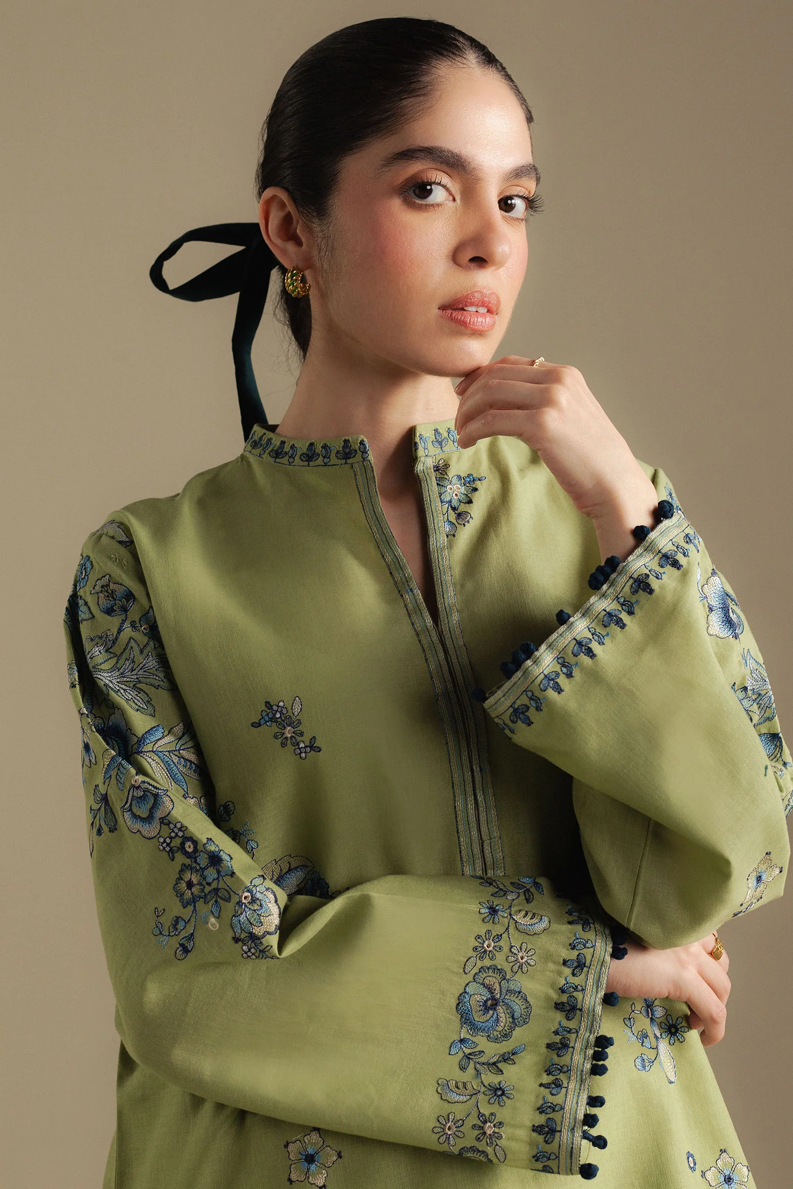 An apple green khaddar shirt and trouser paired with a shawl in apple green and blue, a fresh, lively mix that carries winter brightness with ease.