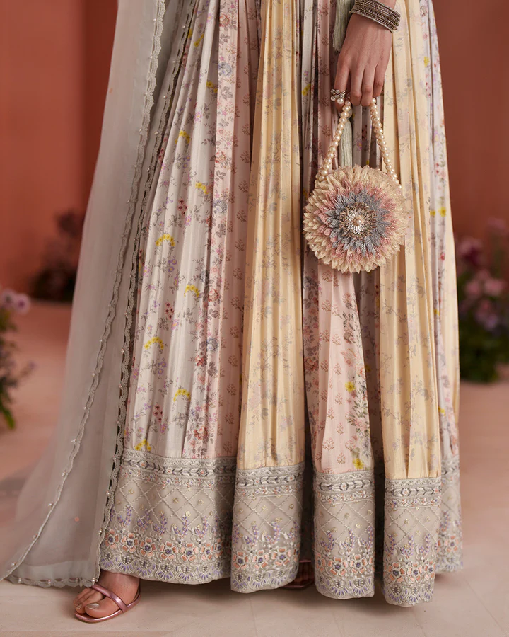 Echoing refined sophistication, Tehani harmonises soft tones with elaborate adornment. Set on pastel printed Korean raw silk, the pishwas carries an artfully composed blend of resham and sequin work that lends a delicate glow. Paired with Korean Raw Silk trousers and an intricately embroidered organza dupatta, this outfit brings together a classic silhouette that elevates your presence at every occasion.