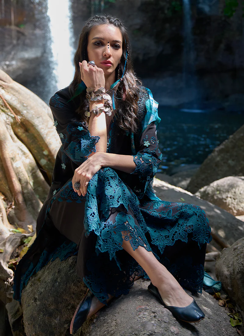 This unstitched pure cotton lawn shirt is rendered in a deep black base, highlighted with contrasting teal floral and vine-inspired motifs that create a striking, all-over fabric pattern. The design is anchored with bold ornamental borders along the edges, adding depth and visual emphasis to the composition. Paired with a pure cotton cambric trouser and a chiffon dupatta featuring complementary printed details, the ensemble delivers a strong visual presence while remaining breathable and well-suited for summer wear.